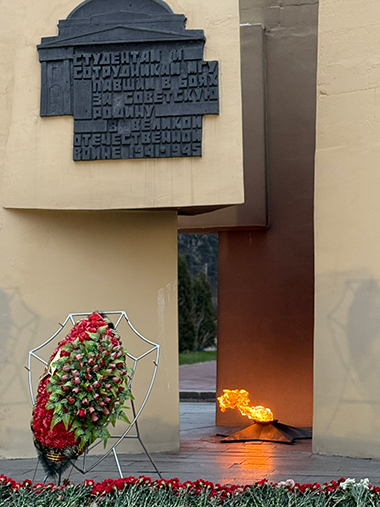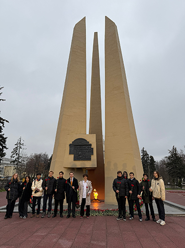 Ребята возложили цветы к мемориальному комплексу «Вечный огонь», посвященному памяти студентов и преподавателей МГУ, погибших в годы Великой Отечественной войны.